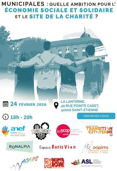🐝 Mardi 24 Février de 18h à 20h : L'ESS stéphanoise s'organise pour prendre sa place « Quelle ambition pour l'ESS et le Site de La Charité ? ». Lieu : La Lanterne, Tiers-Lieu d'Entraide Solidaire de Chavanelle, 40 Rue Pointe Cadet à Saint-Etienne