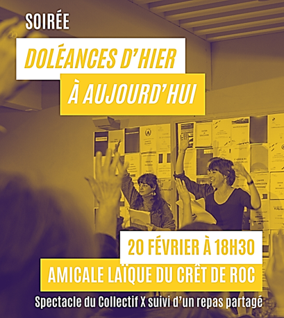🐝 Vendredi 20 Février à 18h30 : Théâtre et Criée publique « Doléances d’hier à aujourd'hui : et si on rouvrait les cahiers ? ». Lieu : Amicale Laïque du Crêt de Roch, 16 rue Royet à Saint-Etienne.