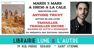 🐝 Mardi 3 Mars à 19h30 : Rencontre avec Antoine Tricot autour de son livre « Travailler, travailler encore : dockers en lutte à Dunkerque ». (Reportage engagé, Editions Créaphis, basées à Saint-Étienne). Lieu : La CALE (Amicale laïque du Crêt de Roch) 16 rue Royet à Saint-Étienne.