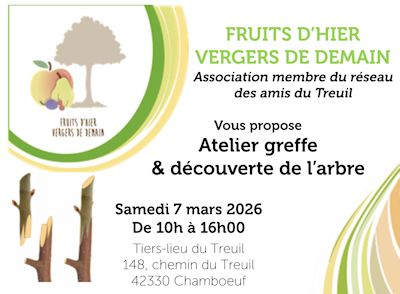🐝 Samedi 7 mars, de l0h à 16h : Atelier « greffe & découverte de l'arbre ». Lieu : Tiers-lieu du Treuil 148, chemin du Treuil à Chamboeuf.