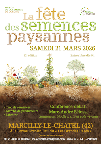 Organisée par la Maison de le Semence de la Loire. Ne ratez pas (à14h30) la Conférence-débat avec Marc-André Selosse (professeur au Muséum d'Histoire naturelle de Paris) : "Semences, biodiversité et sols vivants". Programme complet sur le site ... |