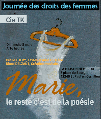 🐝 Dimanche 8 Mars à 16h : A l'occasion de la journée des droits des femmes « Marie / Compagnie TK » Lieu : Maison Mémérou 5, place du bourg à St-Paul en Cornillon.