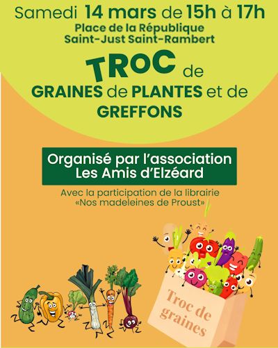 🐝 Samedi 14 mars de 15h à 17h : « Troc de graines, de plantes et de greffons ». Lieu : sous la Halle, place de la République à Saint-Just-St-Rambert.