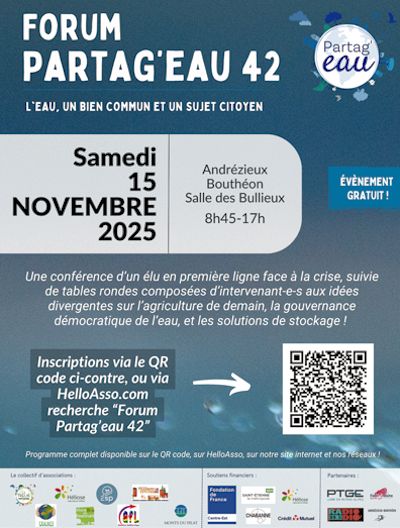 Le Collectif Partag'eau 42, organisateur de ce 3ème forum annuel, est copilotée par 10 organisations citoyennes, diverses mais convaincues par la nécessité de faire participer le plus grand nombre à la préservation de ce bien commun vital. Une conférence d'un élu en première ligne face à la crise sera suivie de tables rondes composées d'intervenant.e.s aux idées divergentes sur l'agriculture de demain, la gouvernance démocratique de l'eau, les solutions de stockage, les autres solutions ... Autres détails + lien d'inscription disponibles ICI . |