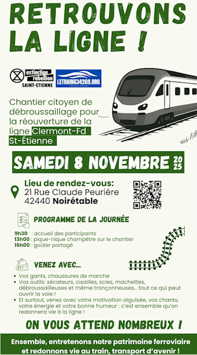 🐝 Samedi 8 novembre à 9h30 : Action citoyenne forte : Chantier de débroussaillage Par XR-St-Etienne et LeTrain634269.org Lieu : RDV au 21 Rue Claude Peurière à Noirétable