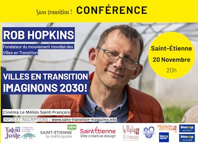 🐝 Jeudi 20 novembre, Accueil 19h30, Début 20h : Conférence de Rob Hopkins : « Villes en transition Imaginons 2030 ! » Lieu : Cinéma Le Méliès Saint-François, 8 rue de la Valse à Saint-Étienne
